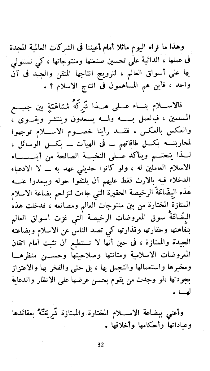 وهذا ما نراه اليوم ماثلا أماما أعيننا في الشركات العالمية المجدة في عملها، الدائبة على تحسين صنعتها ومنتوجاتها، كي تستولي بها على أسواق العالم، لترويج إنتاجها المتقن والجيد في آن واحد، فأين هم المساهمون في إنتاج الإسلام؟.