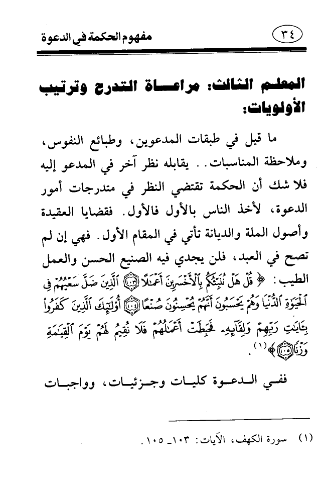 المعلم الثالث: مراعاة التدرج وترتيب الأولويات ما قيل في طبقات المدعوين، وطبائع النفوس، وملاحظة المناسبات. . يقابله نظر آخر في المدعو إليه فلا شك أن الحكمة تقتضي النظر في متدرجات أمور الدعوة، لأخذ الناس بالأول فالأول. فقضايا العقيدة وأصول الملة والديانة تأتي في المقام الأول. فهي إن لم تصح في العبد، فلن يجدي فيه الصنيع الحسن والعمل الطيب: {قُلْ هَلْ نُنَبِّئُكُمْ بِالْأَخْسَرِينَ أَعْمَالًا - الَّذِينَ ضَلَّ سَعْيُهُمْ فِي الْحَيَاةِ الدُّنْيَا وَهُمْ يَحْسَبُونَ أَنَّهُمْ يُحْسِنُونَ صُنْعًا - أُولَئِكَ الَّذِينَ كَفَرُوا بِآيَاتِ رَبِّهِمْ وَلِقَائِهِ فَحَبِطَتْ أَعْمَالُهُمْ فَلَا نُقِيمُ لَهُمْ يَوْمَ الْقِيَامَةِ وَزْنًا} [الكهف: 103 - 105] (¬1) .