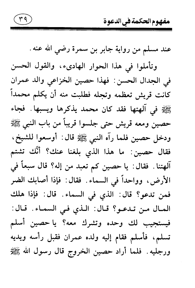 عند مسلم من رواية جابر بن سمرة رضي الله عنه. وتأملوا في هذا الحوار الهادئ، والقول الحسن في الجدال الحسن: «فهذا حصين الخزاعي والد عمران كانت قريش تعظمه وتجله فطلبت منه أن يكلم محمدا صلى الله عليه وسلم في آلهتها فقد كان محمد يذكرها ويسبها. فجاء حصين ومعه قريش حتى جلسوا قريبا من باب النبي صلى الله عليه وسلم ودخل حصين فلما رآه النبي صلى الله عليه وسلم قال: أوسعوا للشيخ، فقال حصين: ما هذا الذي بلغنا عنك؟ أنك تشتم آلهتنا. فقال: يا حصين كم تعبد من آله؟ قال سبعا في الأرض، وواحدا في السماء. فقال: فإذا أصابك الضر فمن تدعو؟ قال: الذي في السماء. قال: فإذا هلك المال من تدعو؟ قال: الذي في السماء. قال: يستجيب لك وحده وتشرك معه؟ يا حصين أسلم تسلم، فأسلم فقام إليه ولده عمران فقبل رأسه ويديه ورجليه. فلما أراد حصين الخروج قال رسول الله صلى الله عليه وسلم