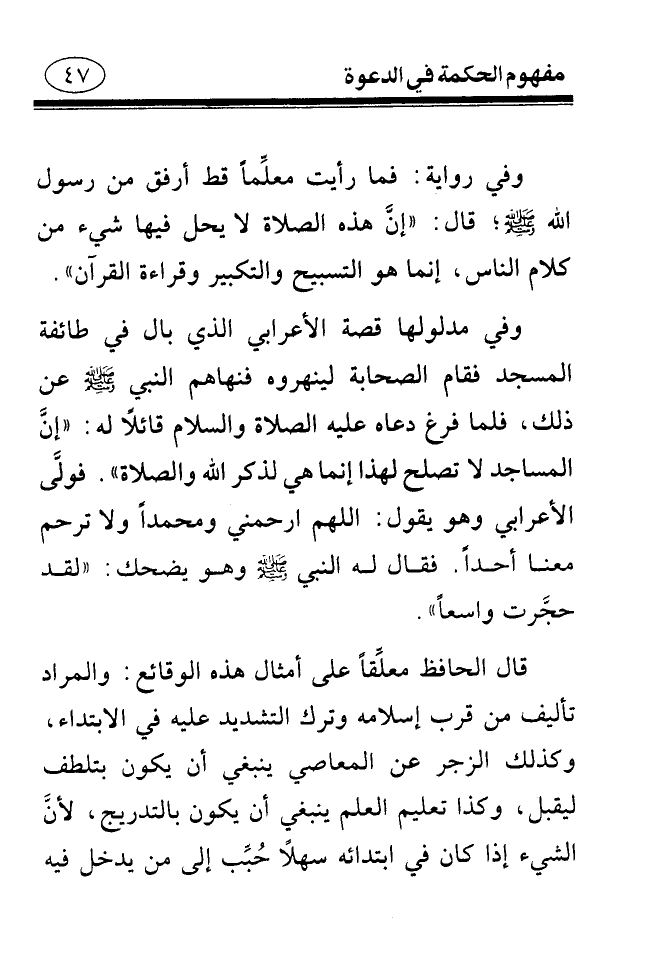 قال الحافظ معلقا على أمثال هذه الوقائع: والمراد من قرب إسلامه وترك التشديد عليه في الابتداء، وكذلك الزجر عن المعاصي ينبغي أن يكون بتلطف ليقبل، وكذا تعليم العلم ينبغي أن يكون بالتدريج، لأن الشيء إذا كان في ابتدائه سهلا حبب إلى من يدخل فيه