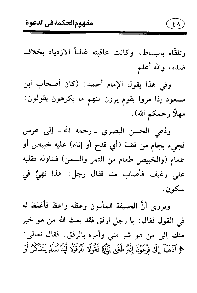 ويروى أن الخليفة المأمون وعظه واعظ فأغلظ له في القول فقال: يا رجل ارفق فقد بعث الله من هو خير منك إلى من هو شر مني وأمره بالرفق. فقال تعالى: {اذْهَبَا إِلَى فِرْعَوْنَ إِنَّهُ طَغَى - فَقُولَا لَهُ قَوْلًا لَيِّنًا لَعَلَّهُ يَتَذَكَّرُ أَوْ يَخْشَى} [طه: 43 - 44] (¬1) .