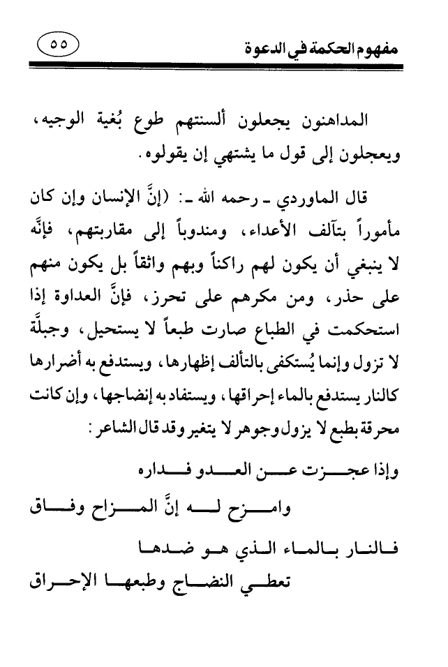 قال الماوردي - رحمه الله -: إن الإنسان وإن كان مأمورا بتآلف الأعداء، ومندوبا إلى مقاربتهم، فإنه لا ينبغي أن يكون لهم راكنا وبهم واثقا بل يكون منهم على حذر، ومن مكرهم على تحرز، فإن العداوة إذا استحكمت في الطباع صارت طبعا لا يستحيل، وجبلة لا تزول وإنما يستكفى بالتألف إظهارها، ويستدفع به أضرارها كالنار يستدفع بالماء إحراقها، ويستفاد به إنضاجها، وإن كانت محرقة بطبع لا يزول وجوهر لا يتغير وقد قال الشاعر: