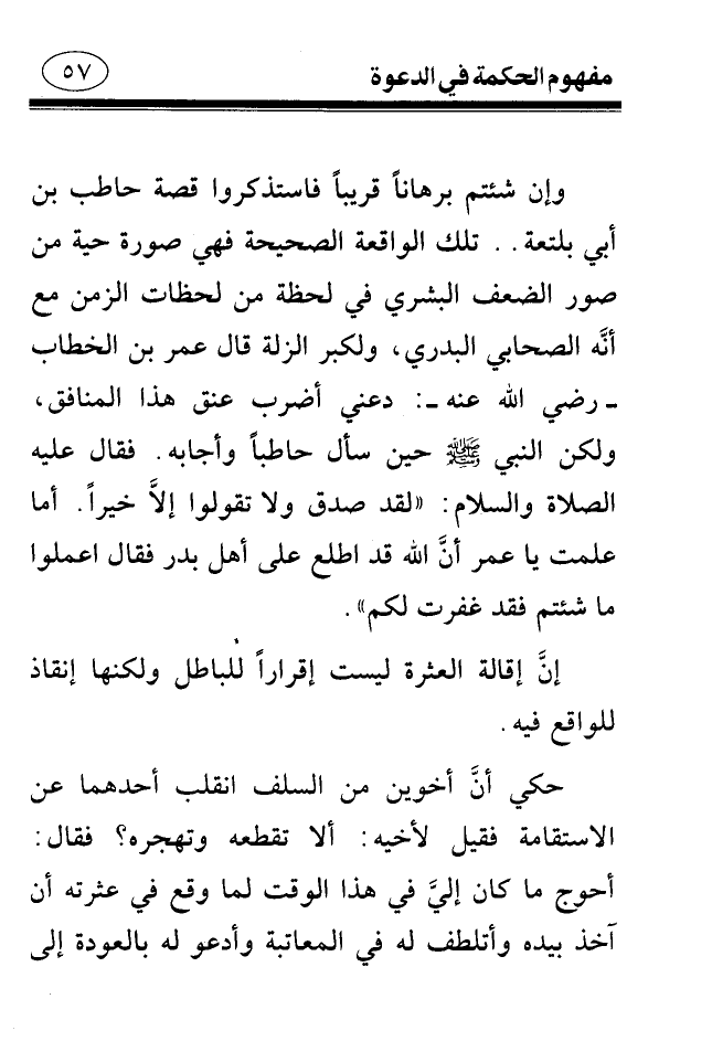 وإن شئتم برهانا قريبا فاستذكروا قصة حاطب بن أبي بلتعة. . تلك الواقعة الصحيحة فهي صورة حية من صور الضعف البشري في لحظة من لحظات الزمن مع أنه الصحابي البدري، ولكبر الزلة قال عمر بن الخطاب - رضي الله عنه -: دعني أضرب عنق هذا المنافق، ولكن النبي صلى الله عليه وسلم حين سأل حاطبا وأجابه. فقال عليه الصلاة والسلام: «لقد صدق ولا تقولوا إلا خيرا. أما علمت يا عمر أن الله قد اطلع على أهل بدر فقال اعملوا ما شئتم فقد غفرت لكم» .