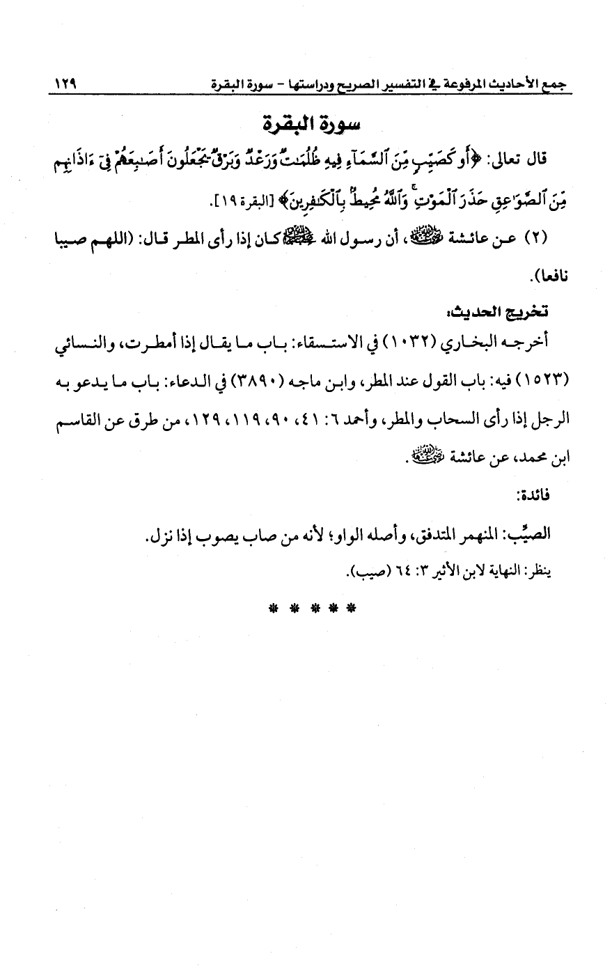 (2) عن عائشة -رضي الله عنه-، أن رسول الله -صلى الله عليه وسلم- كان إذا رأى المطر قال: (اللهم صيبا نافعا).