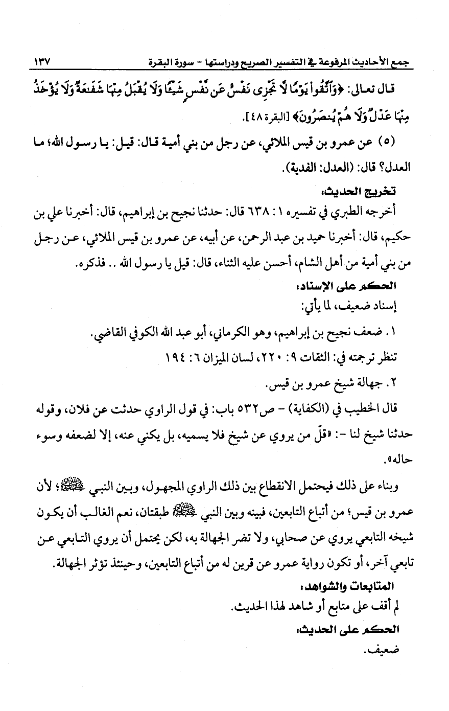 (5) عن عمرو بن قيس الملائي، عن رجل من بني أمية قال: قيل: يا رسول الله؛ ما العدل؟ قال: (العدل: الفدية).