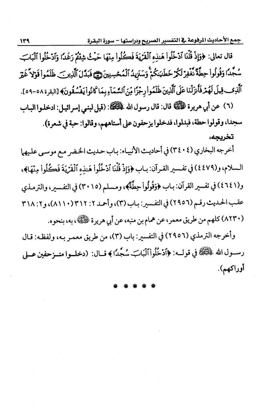(6) عن أبي هريرة -رضي الله عنه- قال: قال رسول الله -صلى الله عليه وسلم-: (قيل لبني إسرائيل: ادخلوا الباب سجدا، وقولوا حطة، فبدلوا، فدخلوا يزحفون من أستاههم، وقالوا: حبة في شعرة).