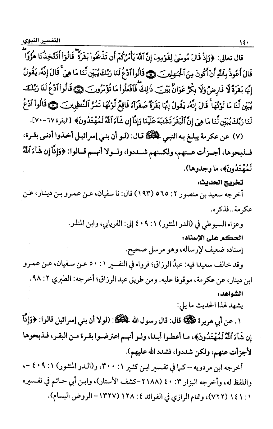 (7) عن عكرمة يبلغ به النبي -صلى الله عليه وسلم- قال: (لو أن بني إسرائيل أخذوا أدنى بقرة، فذبحوها، أجزأت عنهم، ولكنهم شددوا، ولولا أنهم قالوا: {وَإِنَّا إِنْ شَاءَ اللَّهُ لَمُهْتَدُونَ}، ما وجدوها).