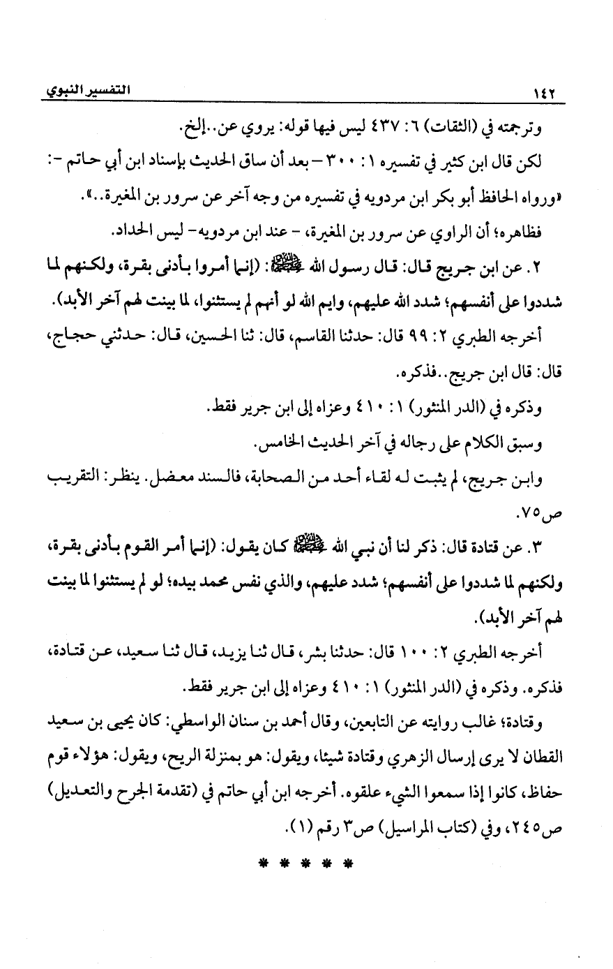 3 - عن قتادة قال: ذكر لنا أن نبي الله -صلى الله عليه وسلم- كان يقول: (إنما أمر القوم بأدنى بقرة، ولكنهم لما شددوا على أنفسهم؛ شدد عليهم، والذي نفس محمد بيده؛ لو لم يستثنوا لما بينت لهم آخر الأبد).