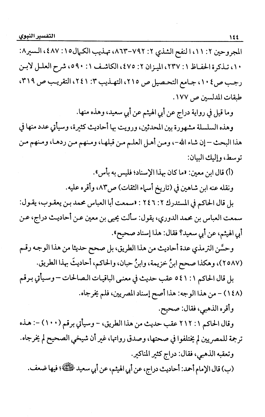 بل قال الحاكم في المستدرك 2: 246: "سمعت أبا العباس محمد بن يعقوب، يقول: سمعت العباس بن محمد الدوري، يقول: سألت يحيى بن معين عن أحاديث دراج، عن أبي الهيثم، عن أب سعيد؟ فقال: هذا إسناد صحيح".