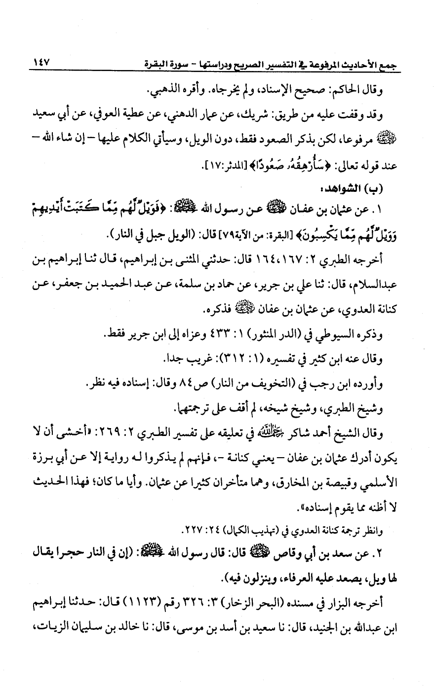 1 - عن عثمان بن عفان -رضي الله عنه- عن رسول الله -صلى الله عليه وسلم-: {فَوَيْلٌ لَهُمْ مِمَّا كَتَبَتْ أَيْدِيهِمْ وَوَيْلٌ لَهُمْ مِمَّا يَكْسِبُونَ} [البقرة: من الآية 79] قال: (الويل جبل في النار).