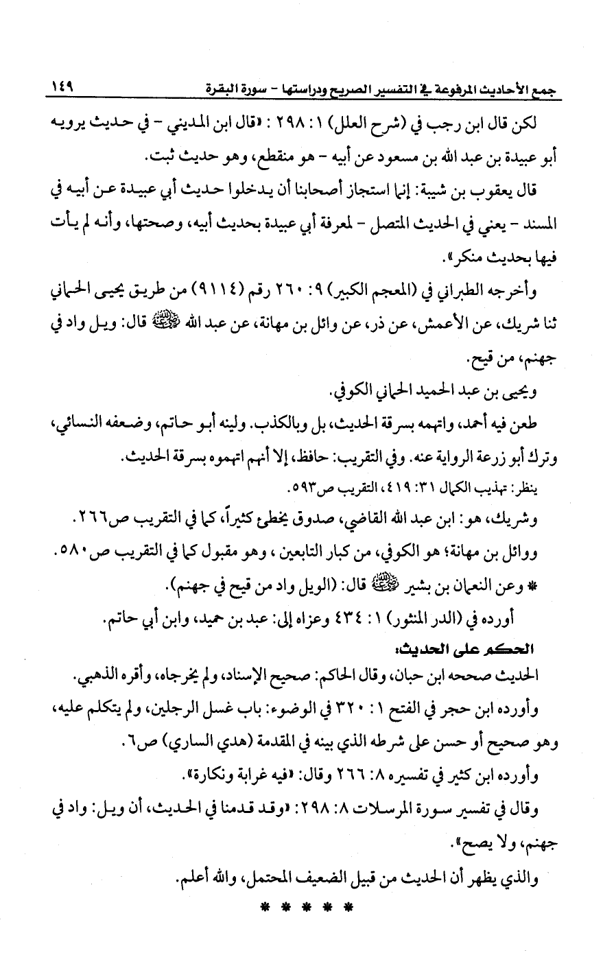 وأخرجه الطبراني في (المعجم الكبير) 9: 260 رقم (9114) من طريق يحيى الحماني ثنا شريك، عن الأعمش، عن ذر، عن وائل بن مهانة، عن عبد الله -رضي الله عنه- قال؛ ويل واد في جهنم، من قيح.