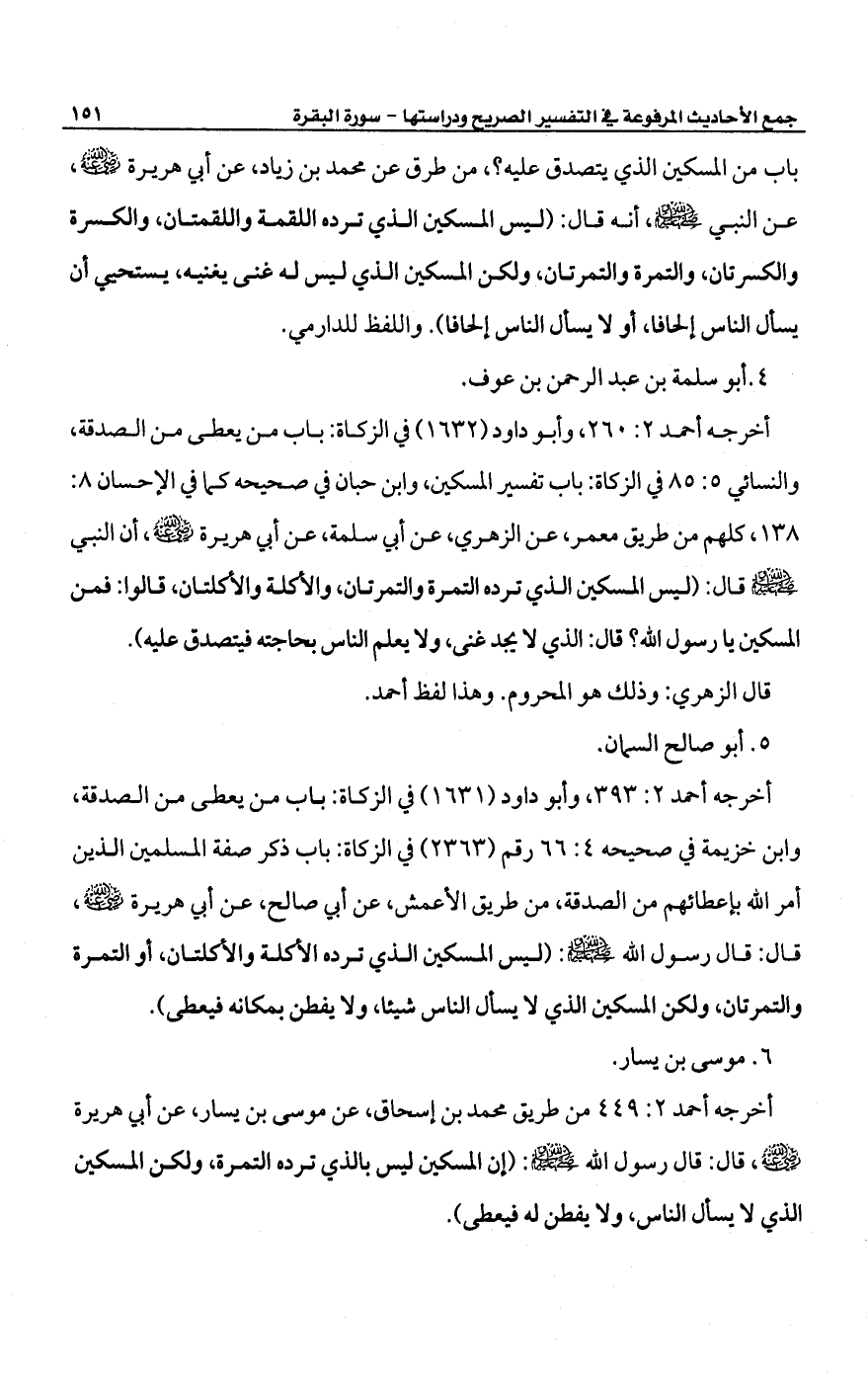باب من المسكين الذي يتصدق عليه؟، من طرق عن محمد بن زياد، عن أبي هريرة -رضي الله عنه-، عن النبي -صلى الله عليه وسلم-، أنه قال: "ليس المسكن الذي ترده اللقمة واللقمتان، والكسرة والكسرتان، والتمرة والتمرتان، ولكن المسكين الذي ليس له غنى يغنيه، يستحيي أن يسأل الناس إلحافا، أو لا يسأل الناس إلحافا). واللفظ للدارمي.