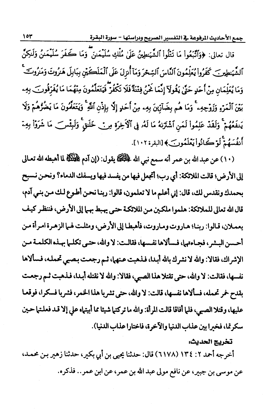 (10) عن عبد الله بن عمر أنه سمع نبي الله -صلى الله عليه وسلم- يقول: (إن آدم -عليه السلام- أهبطه الله تعالى إلى الأرض؛ قالت الملائكة: أي رب؛ أتجعل فيها من يفسد فيها ويسفك الدماء؟ ونحن نسبح بحمدك ونقدس لك، قال: إني أعلم ما لا تعلمون قالوا: ربنا نحن أطوع لك من بني آدم، قال الله تعالى للملائكة: هلموا ملكين من الملاتكة حتّى بهبط بهما إلى الأرض، فننظر كيف يعملان قالوا: ربنا؛ هاروت وماروت، فأهبطا إلى الأرض، ومثلت لهما الزهرة امرأة من أحسن البشر، فجاءتهما، فسألاها نفسها، فقالت: لا والله حتى تكلما بهذه الكلمة من الإشراك، فقالا: والله لا نشرك بالله أبدا، فذهبت عنهما، ثم رجعت بصبي تحمله، فسألاها نفسها، فقالت: لا والله حتى تقتلا هذا الصبي، فقالا: والله لا نقتله أبدا، فذهبت ثم رجعت بقدح خمر تحمله فسألاها نفسها، قالت: لا ولله، حتى تشربا هذا الخمر، فشربا فسكرا، فوقعا عليها، وقتلا الصبي، فلما أفاقا قالت المرأة: والله ما تركتما شيئا مما أبيتماه علي إلا قد فعلتما حين سكرتما، فخيرا بين عذاب الدنيا والآخرة، فاختارا عذاب الدنيا).