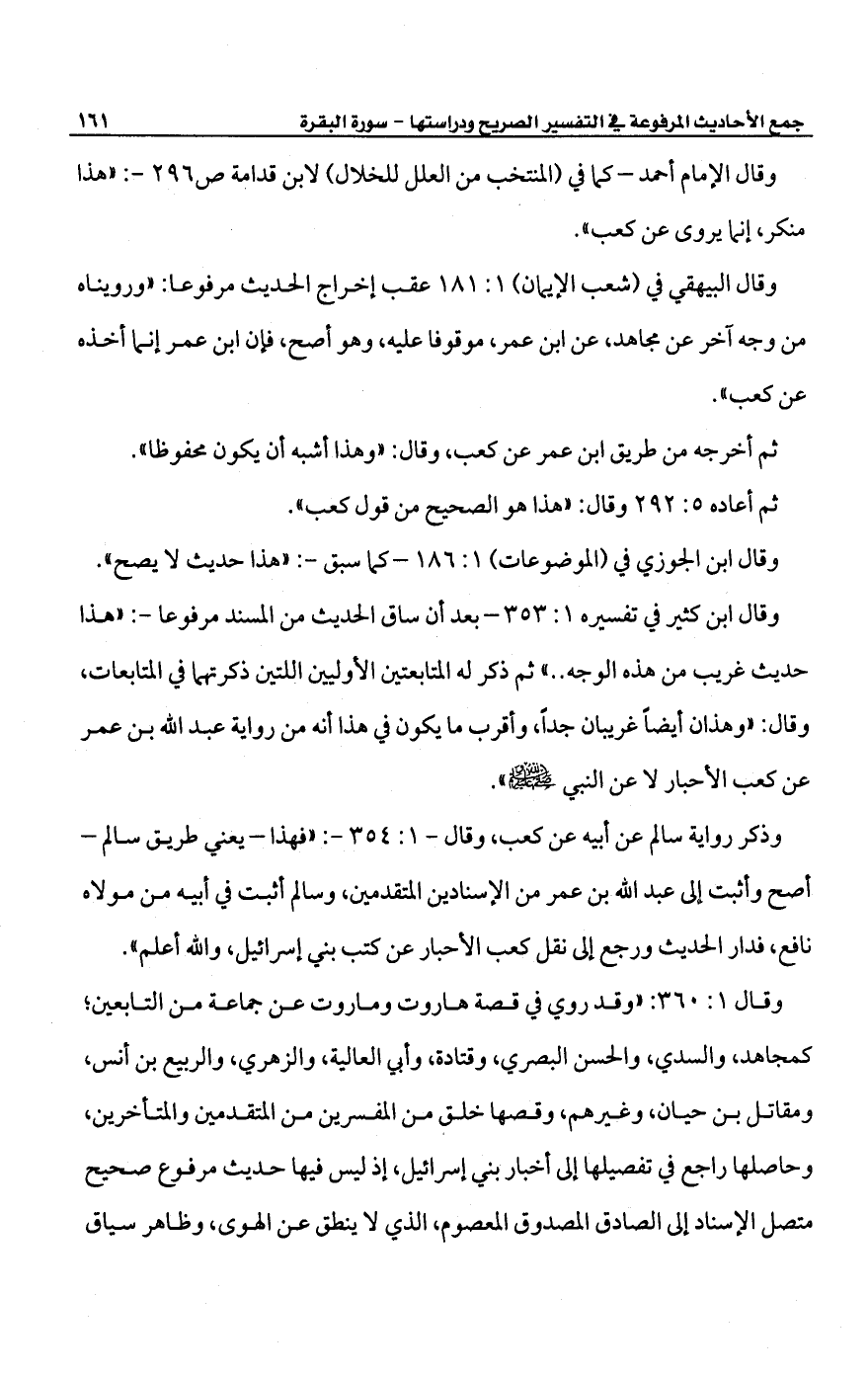 وذكر رواية سالم عن أبيه عن كعب، وقال -1: 354 - : "فهذا -يعني طريق سالم- أصح وأثبت إلى عبد الله بن عمر من الإسنادين المتقدمين، وسالم أثبت في أبيه من مولاه نافع، فدار الحديث ورجع إلى نقل كعب الأحبار عن كتب بني إسرائيل، والله أعلم".
