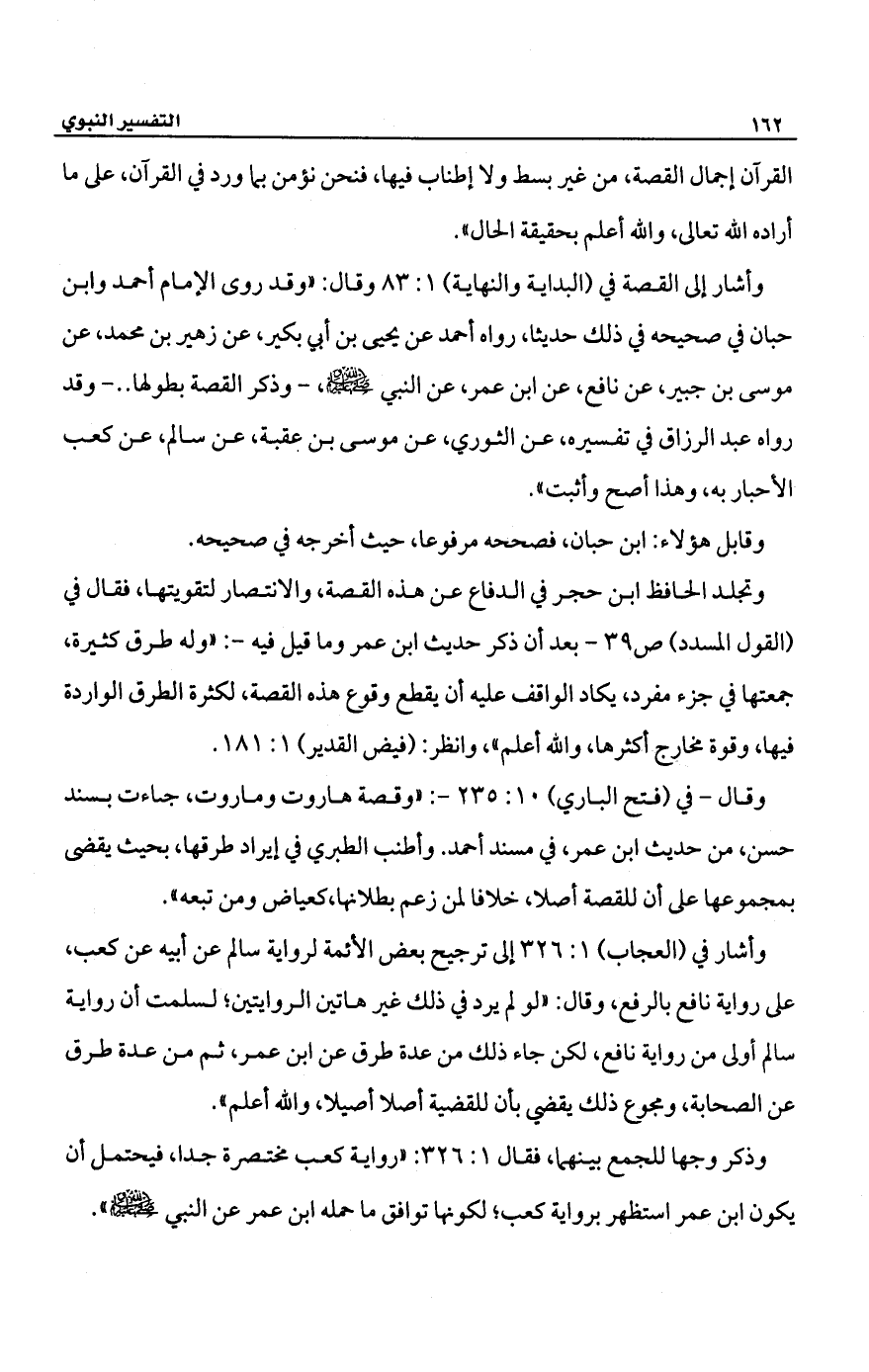 وأشار في (العجاب) 1: 326 إلى ترجيح بعض الأئمة لرواية سالم عن أبيه عن كعب، على رواية نافع بالرفع، وقال: "لو لم يرد في ذلك غير هاتين الروايتين؛ لسلمت أن رواية سالم أولى من رواية نافع، لكن جاء ذلك من عدة طرق عن ابن عمر، ثم من عدة طرف عن الصحابة، ومجوع ذلك يقضي بأن للقضية أصلا أصيلا، والله أعلم".