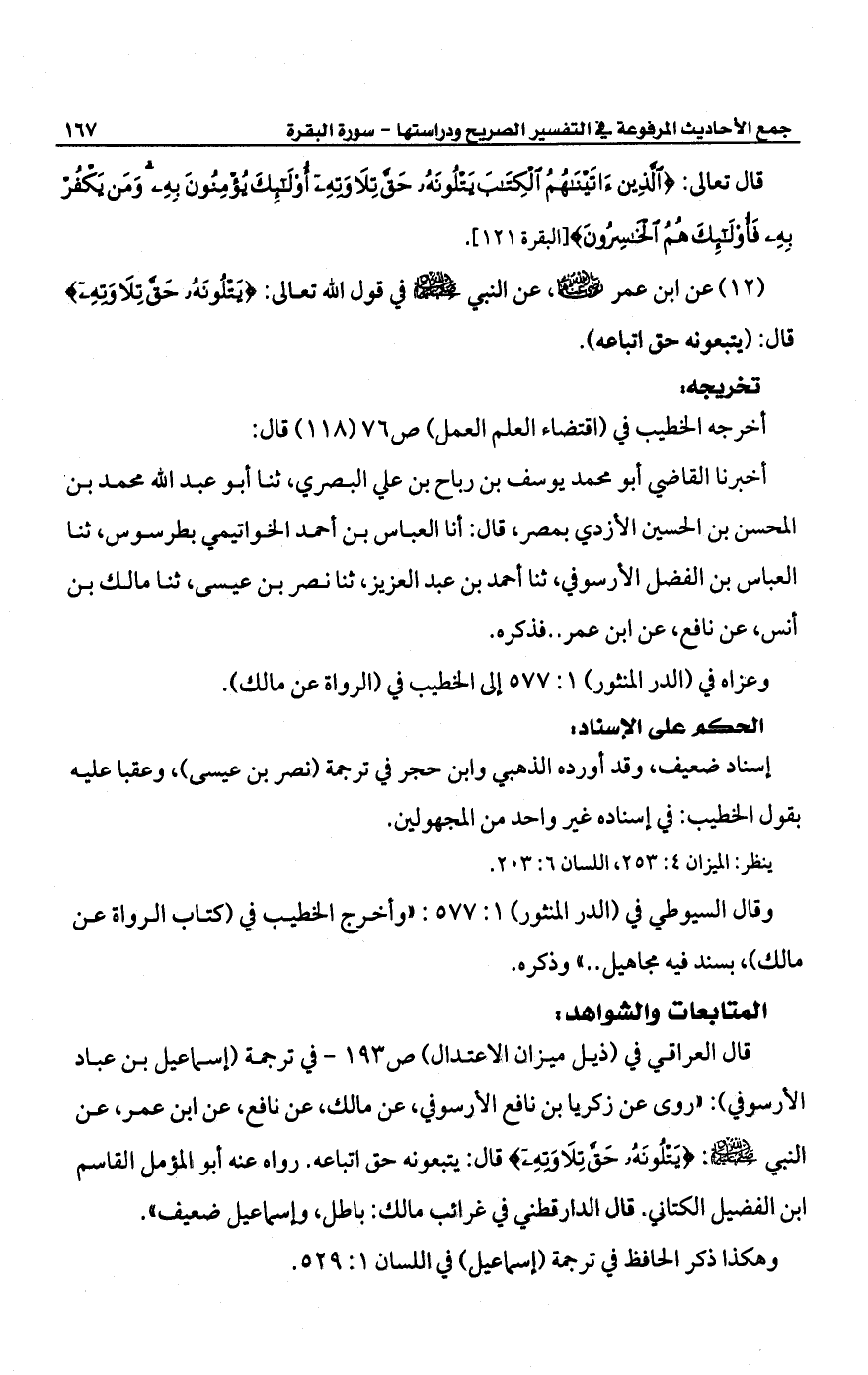قال العراقي في (ذيل ميزان الاعتدال) ص 193 - في ترجمة (إسماعيل بن عباد الأرسوفي): "روى عن زكريا بن نافع الأرسوفي، عن مالك، عن نافع، عن ابن عمر، عن النبي -صلى الله عليه وسلم-: {يَتْلُونَهُ حَقَّ تِلَاوَتِهِ} قال: يتبعونه حق اتباعه. رواه عنه أبو المؤمل القاسم ابن الفضيل الكتاني. قال الدارقطني في غرائب مالك: باطل، وإسماعيل ضعيف".