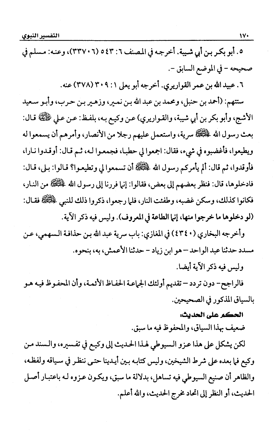 ستتهم: (أحمد بن حنبل، ومحمد بن عبد الله بن نمير، وزهير بن حرب، وأبو سعيد الأشج، وأبو بكر بن أبي شيبة، والقواريري) عن وكيع به، بلفظ: عن علي -رضي الله عنه- قال: بعث رسول الله -صلى الله عليه وسلم- سرية، واستعمل عليهم رجلا من الأنصار، وأمرهم أن يسمعوا له ويطيعوا، فأغضبوه في شيء، فقال: اجمعوا لي حطبا، فجمعوا له، ثم قال: أوقدوا نارًا، فأوقدوا، ثم قال: ألم يأمركم رسول الله -صلى الله عليه وسلم- أن تسمعوا لي وتطيعوا؟ قالوا: بلى، قال: فادخلوها، قال: فنظر بعضهم إلى بعض، فقالوا: إنما فررنا إلى رسول الله -صلى الله عليه وسلم- من النار، فكانوا كذلك، وسكن غضبه، وطفئت النار، فلما رجعوا، ذكروا ذلك للنبي -صلى الله عليه وسلم- فقال: (لو دخلوها ما خرجوا منها، إنما الطاعة في المعروف). وليس فيه ذكر الآية.