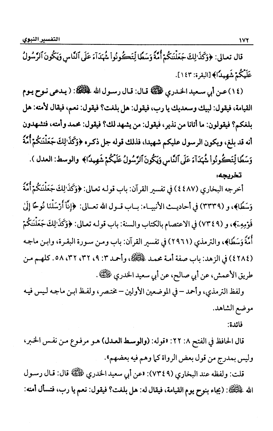 (14) عن أبي سعيد الخدري -رضي الله عنه- قال: قال رسول الله -صلى الله عليه وسلم-: (يدعى نوح يوم القيامة فيقول: لبيك وسعديك يارب، فيقول: هل بلغت؟ فيقول: نعم، فيقال لأمته: هل بلغكم؟ فيقولون: ما أتانا من نذبر، فيقول: من يشهد لك؟ فيقول: محمد وأمته فتشهدون أنه قد بلغ، ويكون الرسول عليكم شهيدًا، فذلك قوله جل ذكره {وَكَذَلِكَ جَعَلْنَاكُمْ أُمَّةً وَسَطًا لِتَكُونُوا شُهَدَاءَ عَلَى النَّاسِ وَيَكُونَ الرَّسُولُ عَلَيْكُمْ شَهِيدًا} والوسط: العدل).