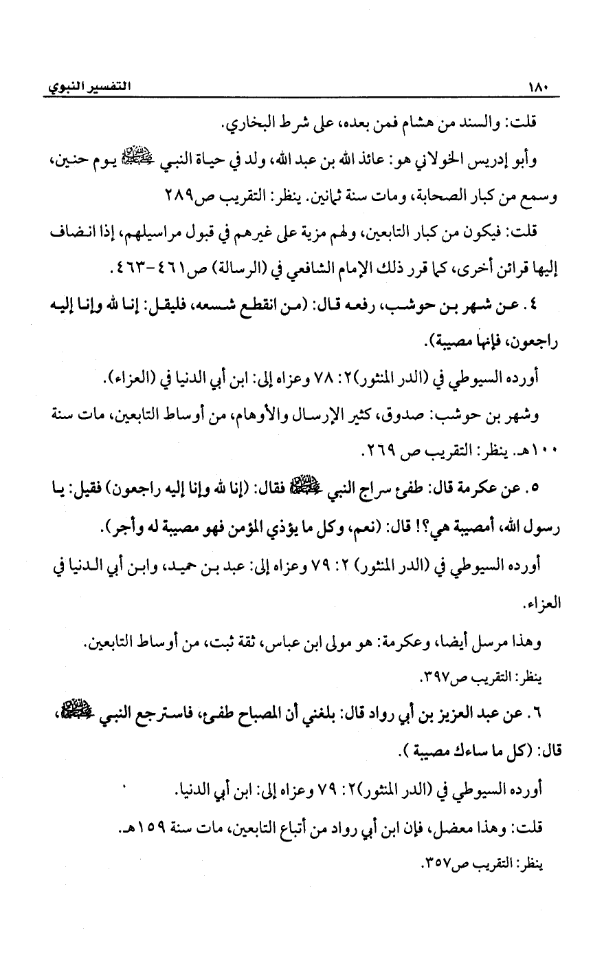5 - عن عكرمة قال: طفىء سراج النبي -صلى الله عليه وسلم- فقال: (إنا لله وإنا إليه راجعون) فقيل: يا رسول الله، أمصيبة هي؟! قال: (نعم، وكل ما يؤذي المؤمن فهو مصيبة له وأجر).