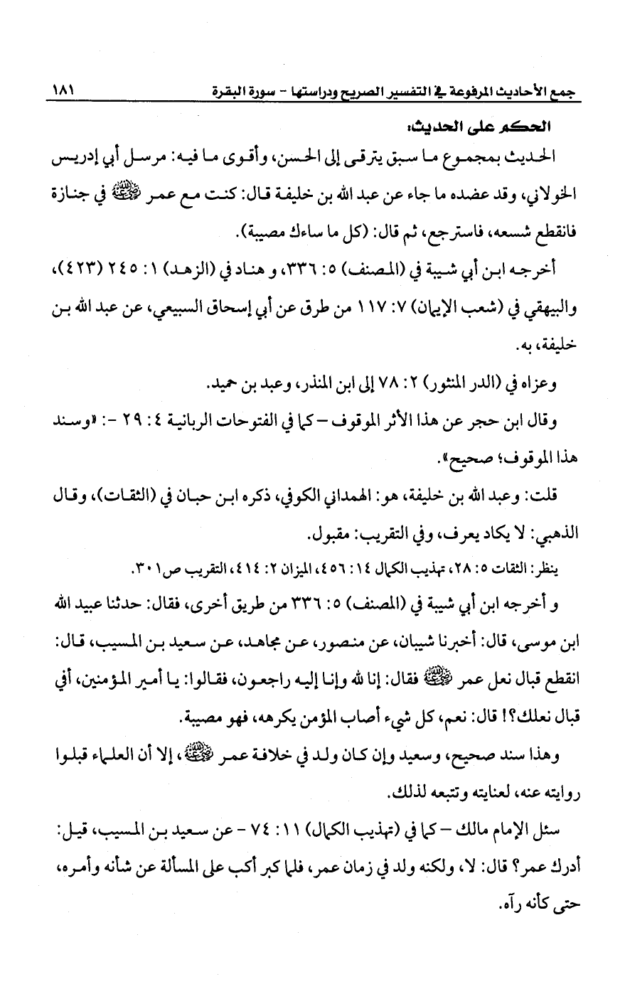 وأخرجه ابن أبي شيبة في (المصنف) 5: 336 من طريق أخرى، فقال: حدثنا عبيد الله ابن موسى، قال: أخبرنا شيبان، عن منصور، عن مجاهد، عن سعيد بن المسيب، قال: انقطع قبال نعل عمر -رضي الله عنه-؛ فقال: إنا لله وإنا إليه راجعون، فقالوا: يا أمير المؤمنين، أفي قبال نعلك؟! قال: نعم، كل شيء أصاب المؤمن يكرهه، فهو مصيبة.