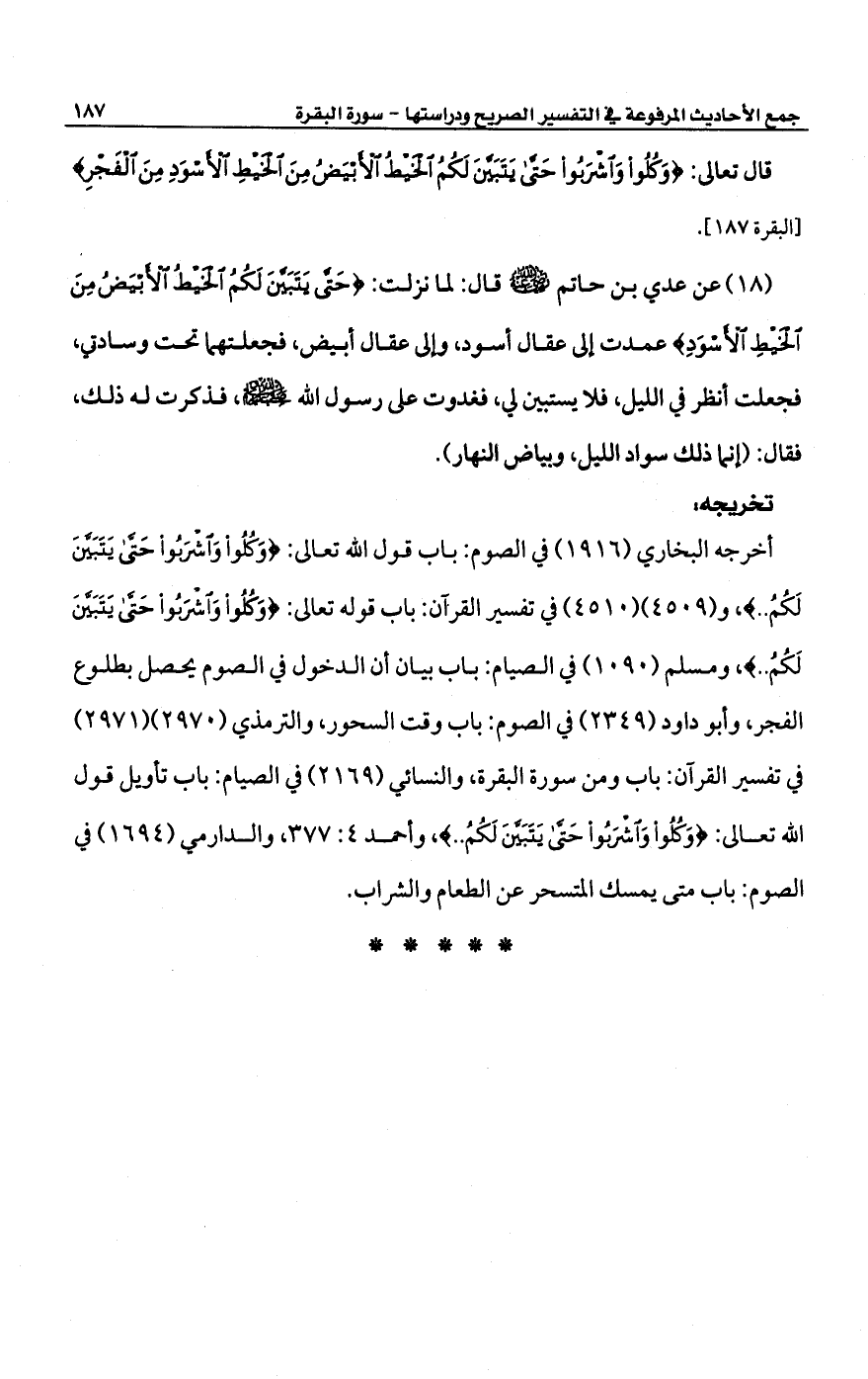 (18) عن عدي بن حاتم -رضي الله عنه- قال: لما نزلت: {حَتَّى يَتَبَيَّنَ لَكُمُ الْخَيْطُ الْأَبْيَضُ مِنَ الْخَيْطِ الْأَسْوَدِ} عمدت إلى عقال أسود، والى عقال أبيض، فجعلتهما تحت وسادتي، فجعلت أنظر في الليل، فلا يستبين لي، فغدوت على رسول الله -صلى الله عليه وسلم-، فذكرت له ذلك، فقال: "إنما ذلك سواد الليل، وبياض النهار).