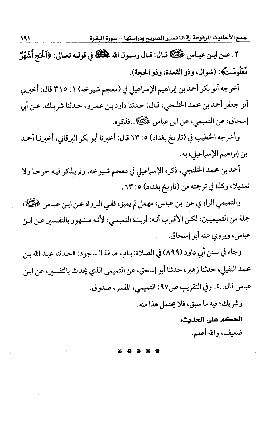 2 - عن ابن عباس -رضي الله عنهما- قال: قال رسول الله -صلى الله عليه وسلم- في قوله تعالى: {الْحَجُّ أَشْهُرٌ مَعْلُومَاتٌ}: (شوال، وذو القعدة، وذو الحجة).