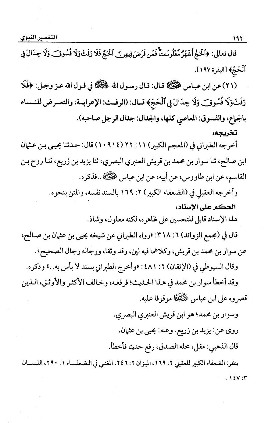 (21) عن ابن عباس -رضي الله عنهما- قال: قال رسول الله -صلى الله عليه وسلم- في قول الله -عَزَّ وَجَلَّ-: {فَلَا رَفَثَ وَلَا فُسُوقَ وَلَا جِدَالَ فِي الْحَجِّ} قال: (الرفث: الإعرابة، والتعرض للنساء بالجماع، والفسوق: المعاصي كلها، والجدال: جدال الرجل صاحبه).