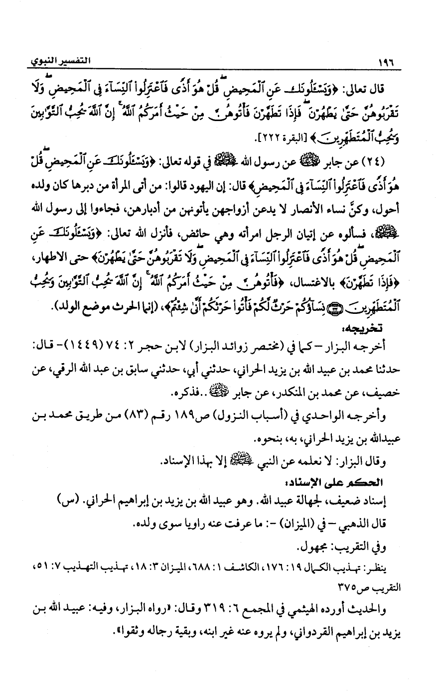 (24) عن جابر -رضي الله عنه- عن رسول الله -صلى الله عليه وسلم- في قوله تعالى: {وَيَسْأَلُونَكَ عَنِ الْمَحِيضِ قُلْ هُوَ أَذًى فَاعْتَزِلُوا النِّسَاءَ فِي الْمَحِيضِ} قال: إن اليهود قالوا: من أتى المرأة من دبرها كان ولده أحول، وكنَّ نساء الأنصار لا يدعن أزواجهن يأتونهن من أدبارهن، فجاءوا إلى رسول الله -صلى الله عليه وسلم- فسألوه عن اتيان الرجل امرأته وهي حائض، فأنزل الله تعالى: {وَيَسْأَلُونَكَ عَنِ الْمَحِيضِ قُلْ هُوَ أَذًى فَاعْتَزِلُوا النِّسَاءَ فِي الْمَحِيضِ وَلَا تَقْرَبُوهُنَّ حَتَّى يَطْهُرْنَ} حتى الاطهار، {فَإِذَا تَطَهَّرْنَ} بالاغتسال، {فَأْتُوهُنَّ مِنْ حَيْثُ أَمَرَكُمُ اللَّهُ إِنَّ اللَّهَ يُحِبُّ التَّوَّابِينَ وَيُحِبُّ الْمُتَطَهِّرِينَ (222) نِسَاؤُكُمْ حَرْثٌ لَكُمْ فَأْتُوا حَرْثَكُمْ أَنَّى شِئْتُمْ} (إنما الحرث موضع الولد).