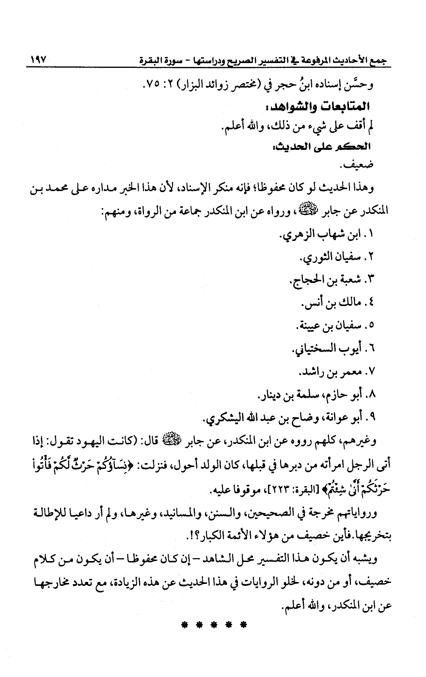 وغيرهم، كلهم رووه عن ابن المنكدر، عن جابر -رضي الله عنه- قال: (كانت اليهود تقول: إذا أتى الرجل امرأته من دبرها في قبلها، كان الولد أحول، فنزلت: {نِسَاؤُكُمْ حَرْثٌ لَكُمْ فَأْتُوا حَرْثَكُمْ أَنَّى شِئْتُمْ} [البقرة: 223]، موقوفًا عليه.