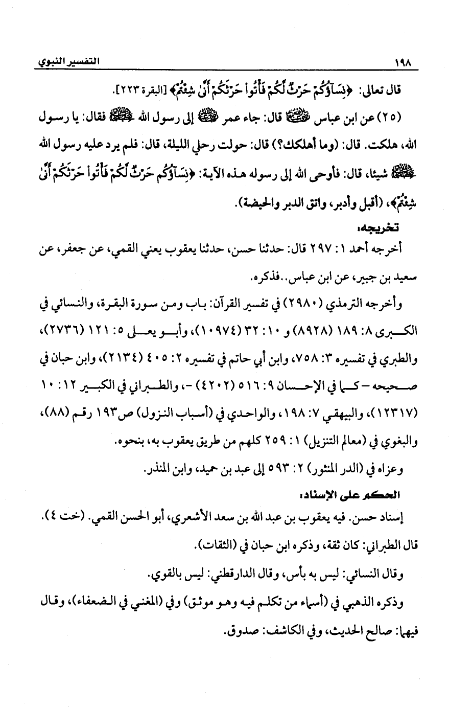 (25) عن ابن عباس -رضي الله عنهما- قال: جاء عمر -رضي الله عنه- إلى رسول الله -صلى الله عليه وسلم- فقال: يا رسول الله، هلكت. قال: (وما أهلكك؟) قال: حولت رحلي اللَّيلة، قال: فلم يرد عليه رسول الله -صلى الله عليه وسلم- شيئًا، قال: فأوحى الله إلى رسوله هذه الآية: {نِسَاؤُكُمْ حَرْثٌ لَكُمْ فَأْتُوا حَرْثَكُمْ أَنَّى شِئْتُمْ}، (أقبل وأدبر، واتق الدبر والحيضة).