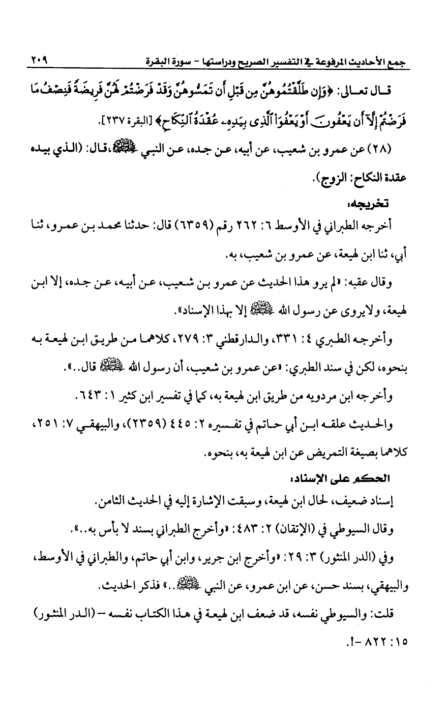 وفي (الدر المنثور) 3: 29: "وأخرج ابن جرير، وابن أبي حاتم، والطبراني في الأوسط، والبيهقي، بسند حسن، عن ابن عمرو، عن النبي -صلى الله عليه وسلم- .. " فذكر الحديث.