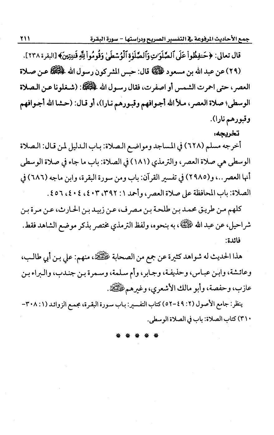 ينظر: جامع الأصول (2: 49 - 52) كتاب التفسير: باب سورة البقرة، مجمع الزوائد (1: 308 - 310) كتاب الصلاة باب في الصلاة الوسطى.