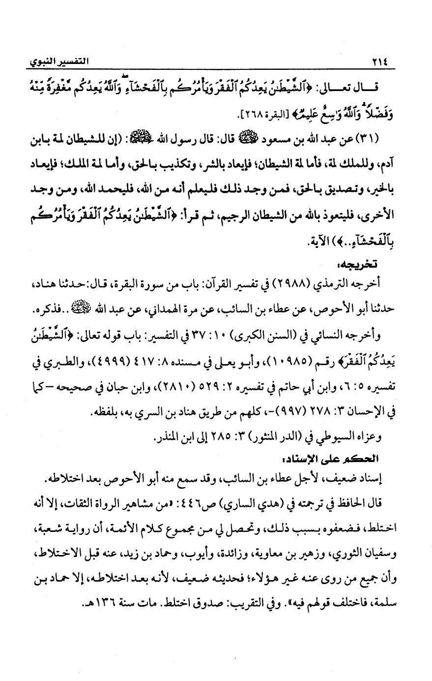 (31) عن عبد الله بن مسعود -رضي الله عنه- قال: قال رسول الله -صلى الله عليه وسلم-: (إن للشيطان لمة باين آدم، وللملك لمة، فأما لمة الشيطان؛ فإيعاد بالشر، وتكذيب بالحق، وأما لمة الملك؛ فإيعاد بالخير، وتصديق بالحق، فمن وجد ذلك فليعلم أنه من الله، فليحمد الله، ومن وجد الأخرى، فليتعوذ بالله من الشيطان الرجيم، ثم قرأ: {الشَّيْطَانُ يَعِدُكُمُ الْفَقْرَ وَيَأْمُرُكُمْ بِالْفَحْشَاءِ ..} الآية.