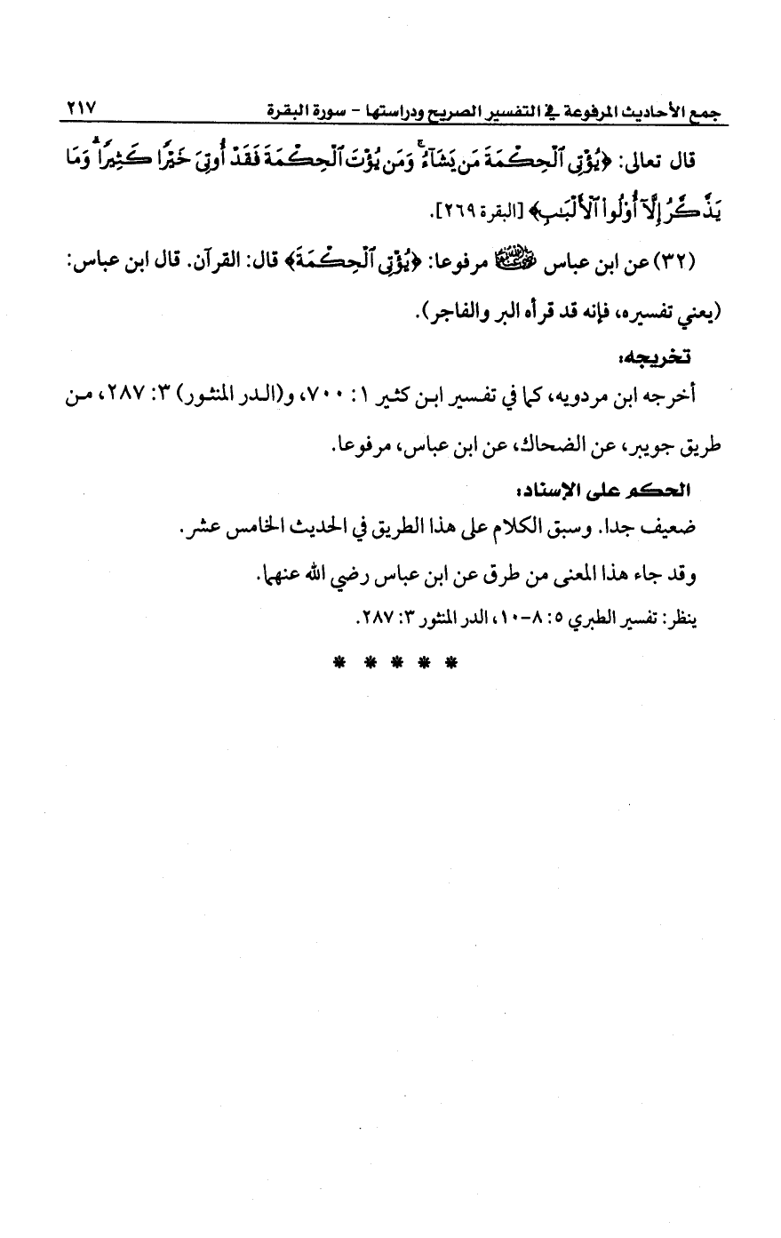 (32) عن ابن عباس -رضي الله عنهما- مرفوعًا: {يُؤْتِي الْحِكْمَةَ} قال: القرآن. قال ابن عباس: (يعني تفسيره، فإنه فد قرأه البر والفاجر).