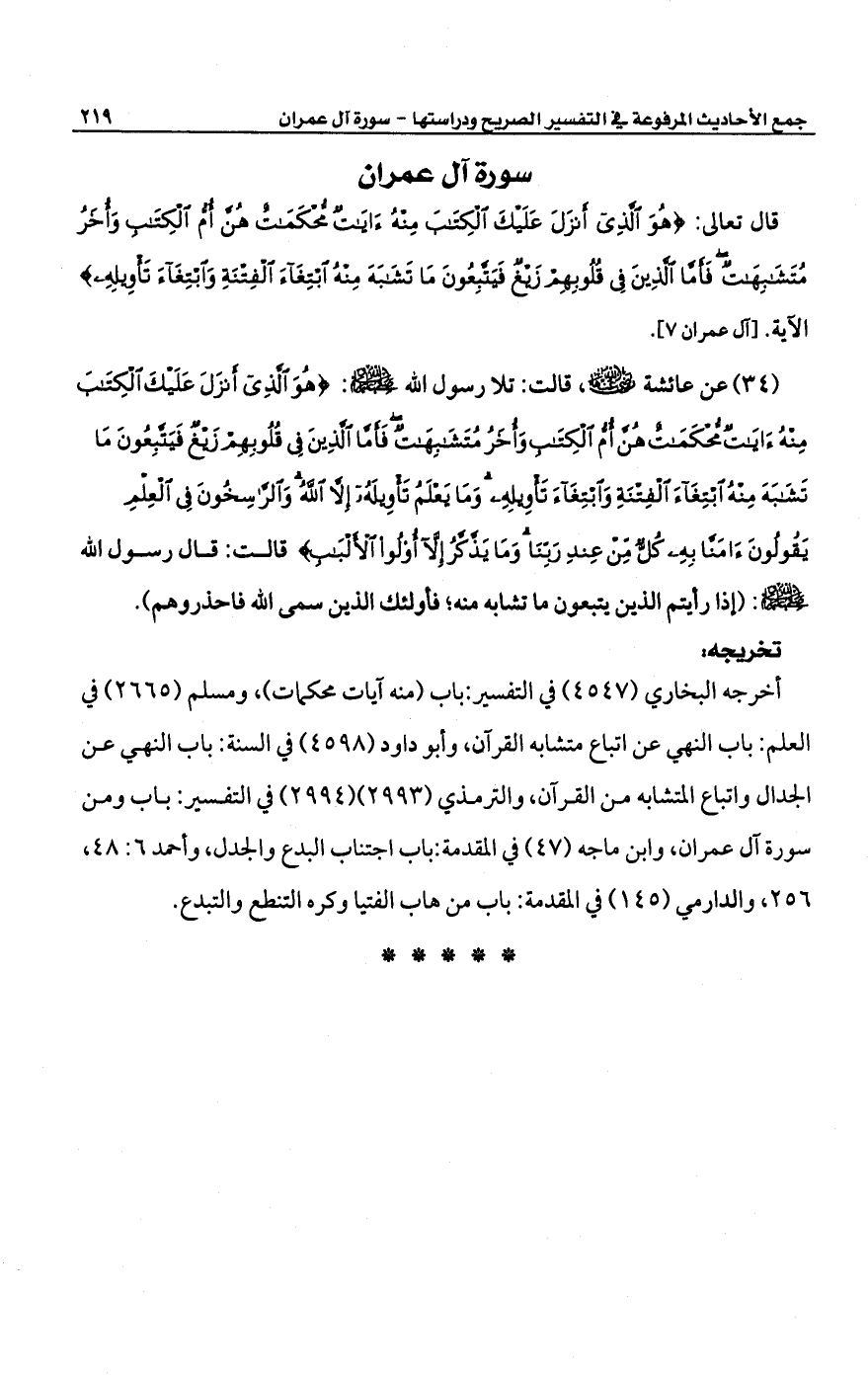 (34) عن عائشة -رضي الله عنها-، قالت: تلا رسول الله -صلى الله عليه وسلم- {هُوَ الَّذِي أَنْزَلَ عَلَيْكَ الْكِتَابَ مِنْهُ آيَاتٌ مُحْكَمَاتٌ هُنَّ أُمُّ الْكِتَابِ وَأُخَرُ مُتَشَابِهَاتٌ فَأَمَّا الَّذِينَ فِي قُلُوبِهِمْ زَيْغٌ فَيَتَّبِعُونَ مَا تَشَابَهَ مِنْهُ ابْتِغَاءَ الْفِتْنَةِ وَابْتِغَاءَ تَأْوِيلِهِ وَمَا يَعْلَمُ تَأْوِيلَهُ إِلا اللَّهُ وَالرَّاسِخُونَ فِي الْعِلْمِ يَقُولُونَ آمَنَّا بِهِ كُلٌّ مِنْ عِنْدِ رَبِّنَا وَمَا يَذَّكَّرُ إِلا أُولُو الْأَلْبَابِ} قالت: قال رسول الله -صلى الله عليه وسلم-: (إذا رأيتم الذين يتبعون ما تشابه منه؛ فاولئك الذين سمى الله فاحذروهم).