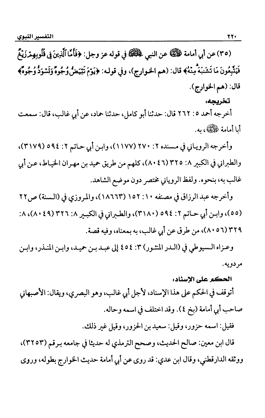 (35) عن أبي أمامة -رضي الله عنه- عن النبي -صلى الله عليه وسلم- في قوله -عَزَّ وَجَلَّ-: {فَأَمَّا الَّذِينَ فِي قُلُوبِهِمْ زَيْغٌ فَيَتَّبِعُونَ مَا تَشَابَهَ مِنْهُ} قال: (هم الخوارج)، وفي قوله: {يَوْمَ تَبْيَضُّ وُجُوهٌ وَتَسْوَدُّ وُجُوهٌ} قال: (هم الخوارج).
