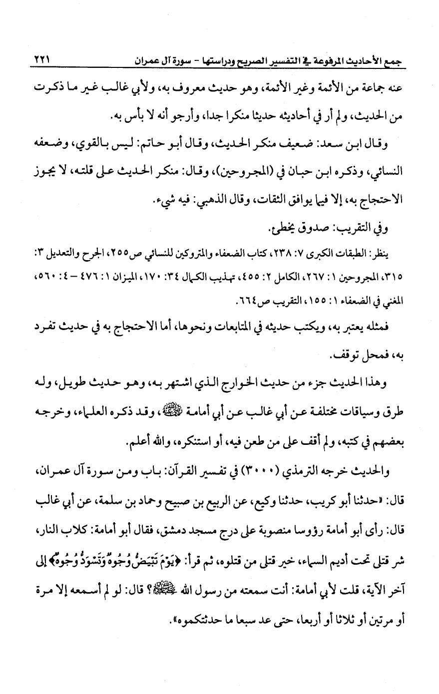 والحديث خرجه الترمذي (3000) في تفسير القرآن: باب ومن سورة آل عمران، قال: "حدثنا أبو كريب، حدثنا وكيع، عن الربيع بن صبيح وحماد بن سلمة، عن أبي غالب قال: رأى أبو أمامة رؤوسا منصوبة على درج مسجد دمشق، فقال أبو أمامة: كلاب النار، شر قتلى تحت أديم السماء، خير. قتلى من قتلوه، ثم قرأ: {يَوْمَ تَبْيَضُّ وُجُوهٌ وَتَسْوَدُّ وُجُوهٌ} إلى آخر الآية، قلت لأبي أمامة: أنت سمعته من رسول الله -صلى الله عليه وسلم-؟ قال: لو لم أسمعه إِلا مرة أو مرتين أو ثلاثا أو أربعا، حتى عد سبعا ما حدثتكموه".