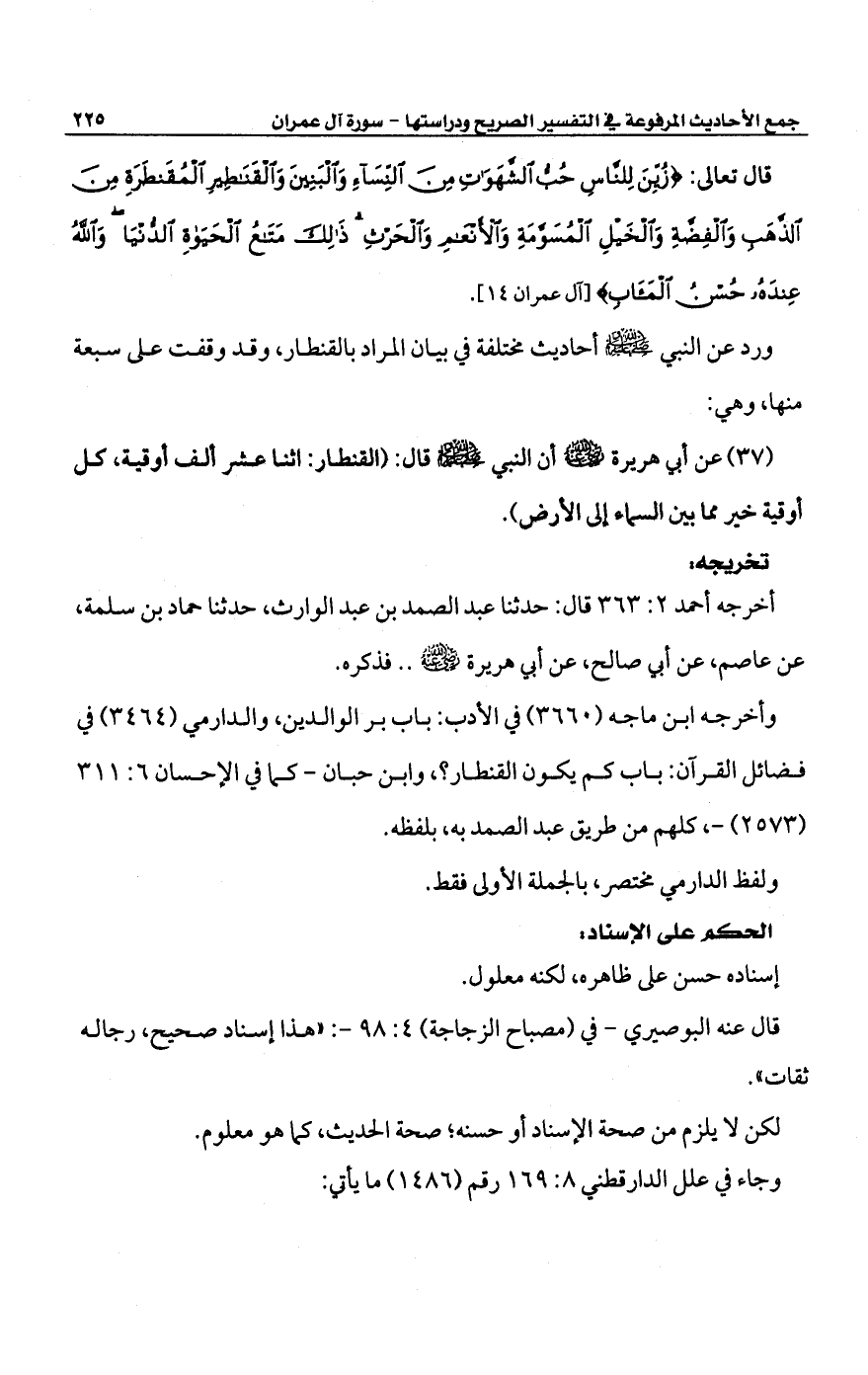 (37) عن أبي هريرة -رضي الله عنه- أن النبي -صلى الله عليه وسلم- قال: (القنطار: اثنا عشر ألف أوقية، كل أوقية خير مما بين السماء الى الأرض).