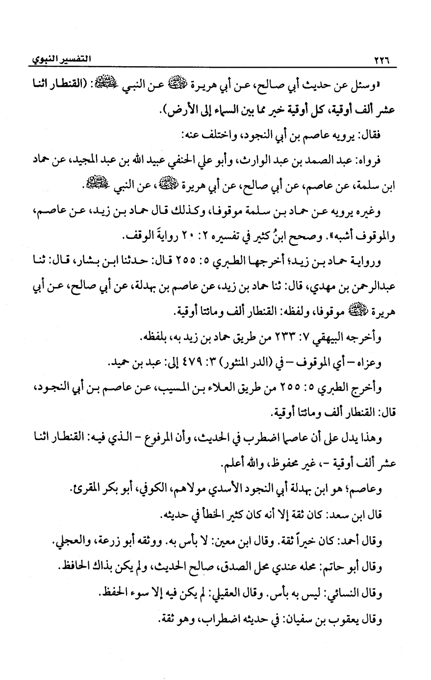 ورواية حماد بن زيدة أخرجها الطبري 5: 255 قال: حدثنا ابن بشار، قال: ثنا عبد الرحمن بن مهدي، قال: ثنا حماد بن زيد، عن عاصم بن بهدلة، عن أبي صالح، عن أبي هريرة -رضي الله عنه- موقوفا، ولفظه: القنطار ألف ومائتا أوقية.