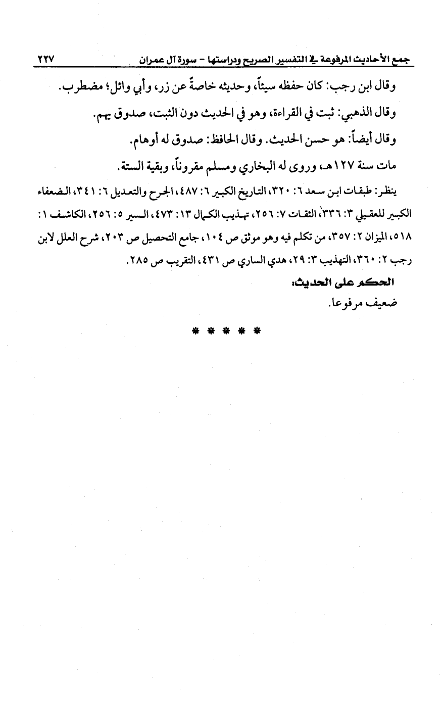 وقال ابن رجب: كان حفظه سيئًا، وحديثه خاصةً عن زر، وأبي وائل؛ مضطرب.