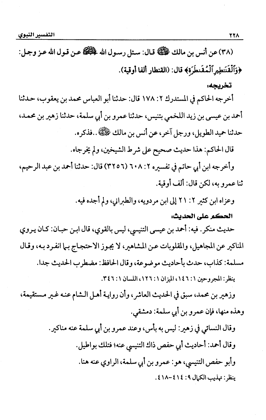 (38) عن أنس بن مالك -رضي الله عنه- قال: سئل رسول الله -صلى الله عليه وسلم- عن قول الله -عَزَّ وَجَلَّ-: {وَالْقَنَاطِيرِ الْمُقَنْطَرَةِ} قال؛ (القنطار ألفا أوقية).
