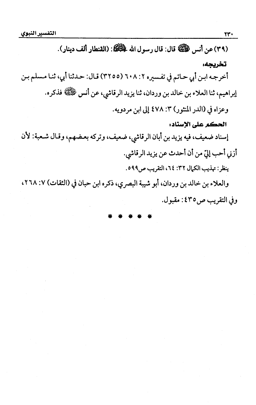 أخرجه ابن أبي حاتم في تفسيره 2: 608 (3255) قال: حدثنا أبي، ثنا مسلم بن إبراهيم، ثنا العلاء بن خالد بن وردان، ثنا يزيد الرقاشي، عن أنس -رضي الله عنه- فذكره.