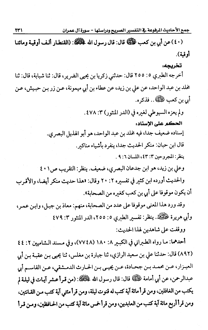 (40) عن أبي بن كعب -رضي الله عنه- قال: قال رسول الله -صلى الله عليه وسلم-: (القنطار ألف أوقية ومائتا أوقية).