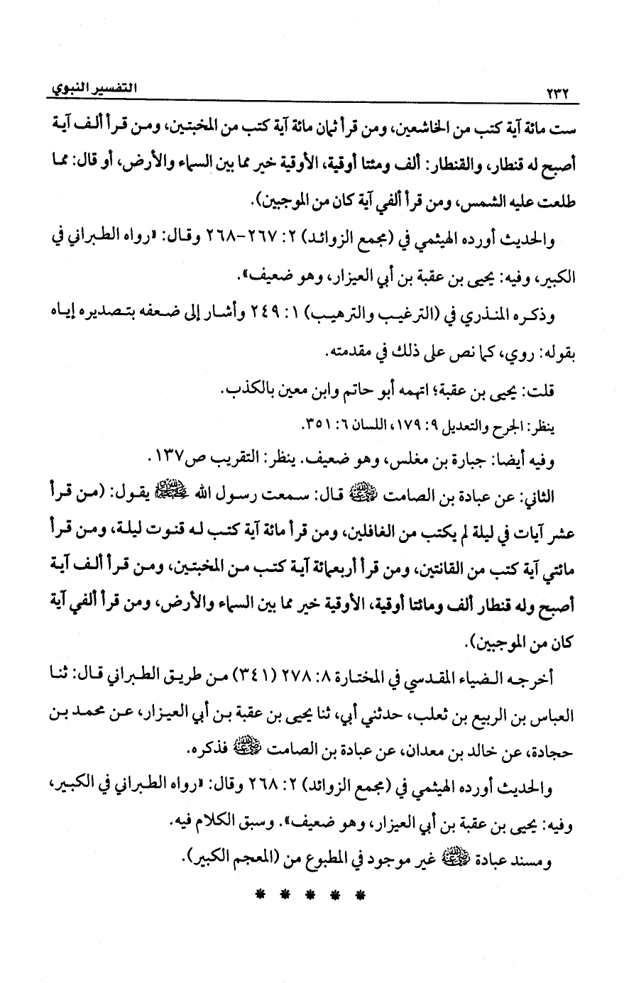 ست مائة آية كتب من الخاشعين، ومن قرأ ثمان مائة آية كتب من المخبتين، ومن قرأ ألف آية أصبح له قنطار، والقنطار: ألف ومئتا أوقية، الأوقية خير مما بين السماء والأرض، أو قال: مما طلعت عليه الشمس، ومن قرأ ألفي آية كان من الموجبين).