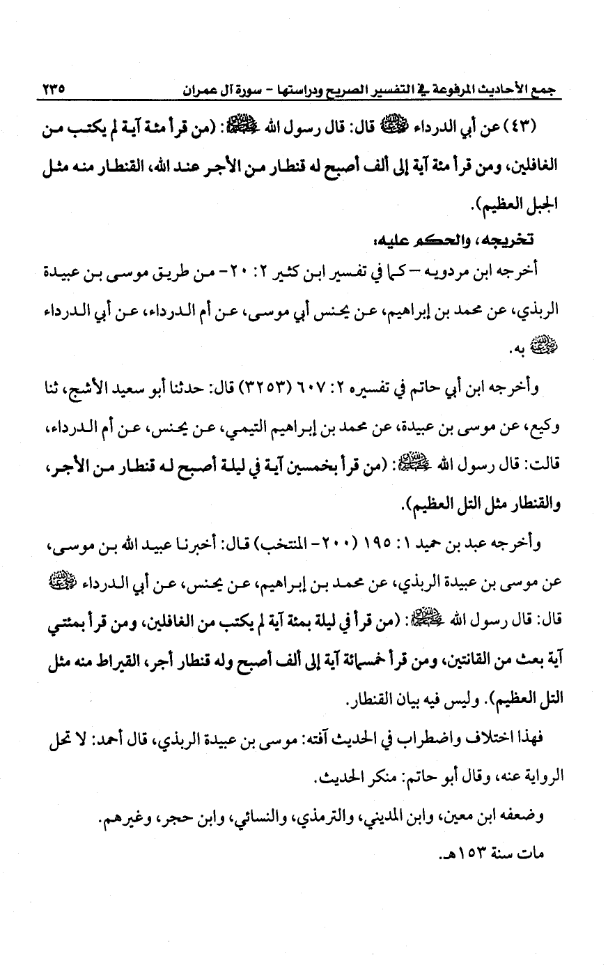 وأخرجه ابن أبي حاتم في تفسيره 2: 607 (3253) قال: حدثنا أبو سعيد الأشج، ثنا وكيع، عن موسى بن عبيدة، عن محمد بن إبراهيم التيمي، عن يحنس، عن أم الدرداء، قالت: قال رسول الله -صلى الله عليه وسلم-: (من قرأ بخمسين آية في ليلة أصبح له قنطار من الأجر، والقنطار مثل التل العظيم).