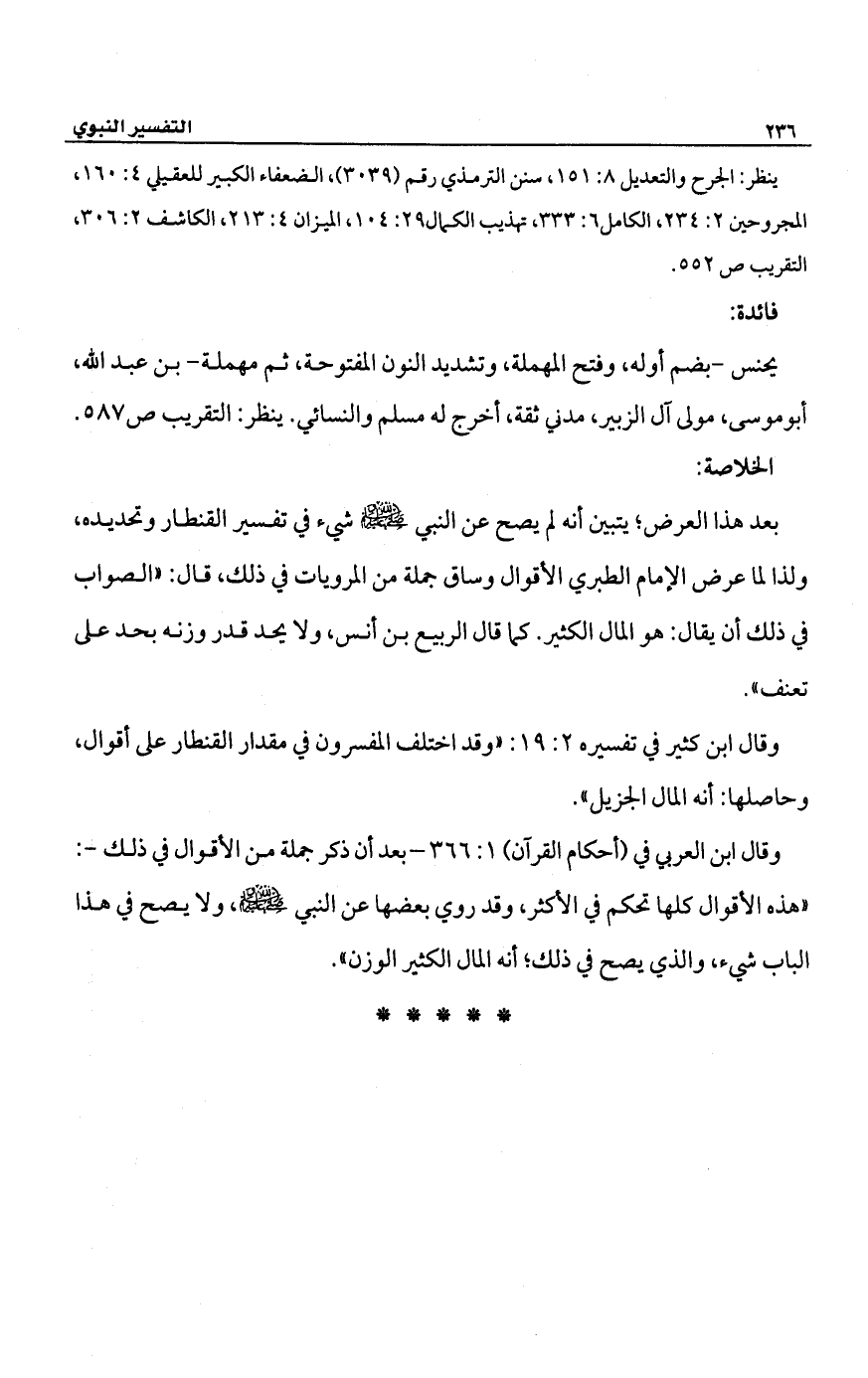 بعد هذا العرض؛ يتبين أنه لم يصح عن النبي -صلى الله عليه وسلم- في تفسير القنطار وتحديده، ولذا لم عرض الإمام الطبري الأقوال وساق جملة من المرويات في ذلك، قال: "الصواب في ذلك أن يقال: هو المال الكثير. كما قال الربيع بن أنس، ولا يحد قدر وزنه بحد على تعنف".