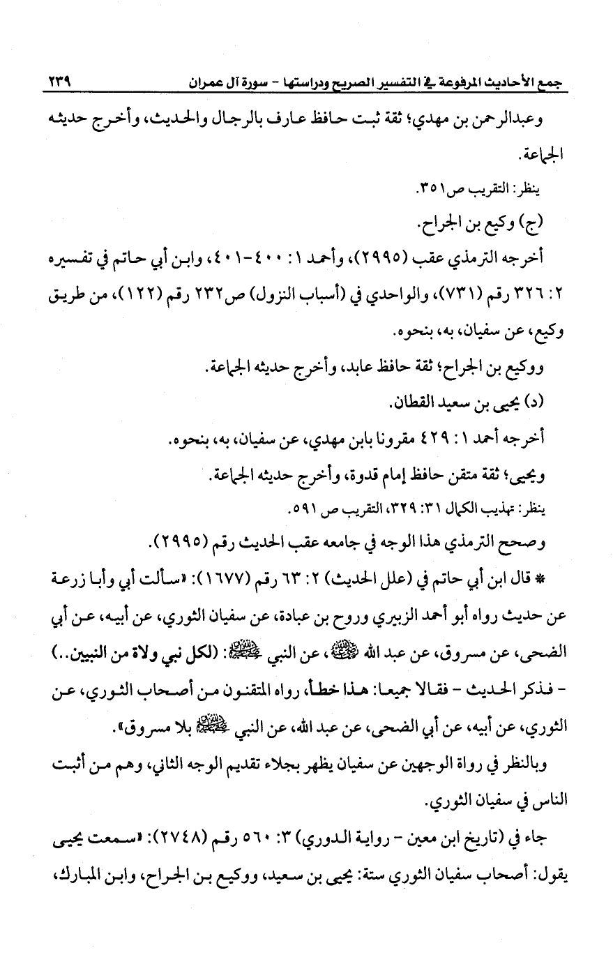 * قال ابن أبي حاتم في (علل الحديث) 2: 63 رقم (1677): "سألت أبي وأبا زرعة عن حديث رواه أبو أحمد الزبيري وروح بن عبادة، عن سفيان الثوري، عن أبيه، عن أبي الضحى، عن مسروق، عن عبد الله -رضي الله عنه-، عن النبي -صلى الله عليه وسلم-: (لكل نبي ولاة من النبيين ..) -فذكر الحديث- فقالا جميعا: هذا خطأ، رواه المتقنون من أصحاب الثوري، عن الثوري، عن أبيه، عن أبي الضحى، عن عبد الله، عن النبي -صلى الله عليه وسلم- بلا مسروق".
