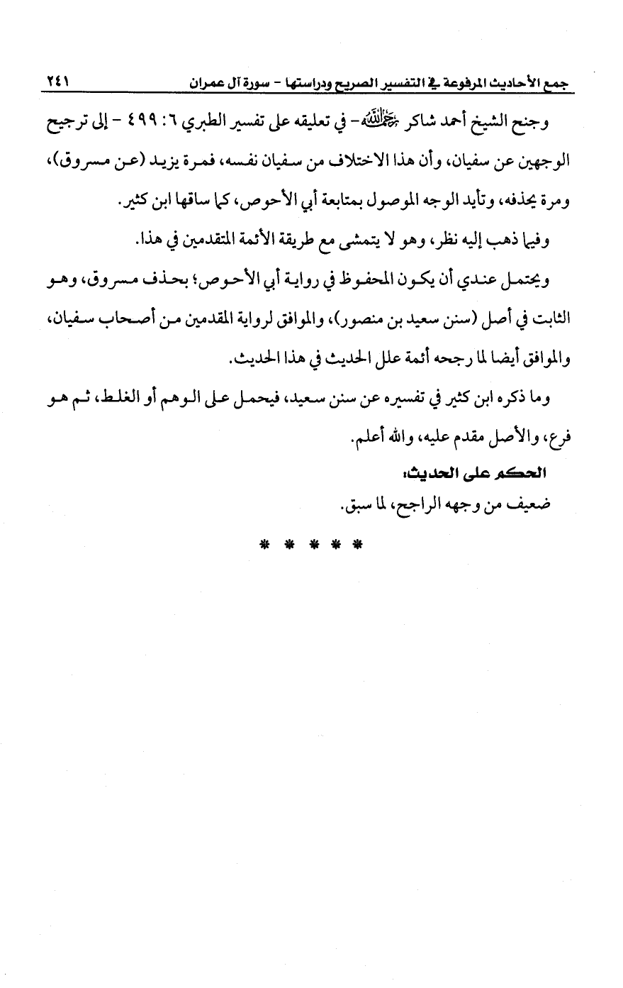 وجنح الشيخ أحمد شاكر -رحمه الله- في تعليقه على تفسير الطبري 6: 499 - إلى ترجيح الوجهين عن سفيان، وأن هذا الاختلاف من سفيان نفسه، فمرة يزيد (عن مسروق)، ومرة يحذفه، وتأيد الوجه الموصول بمتابعة أبي الأحوص، كما ساقها ابن كثير.