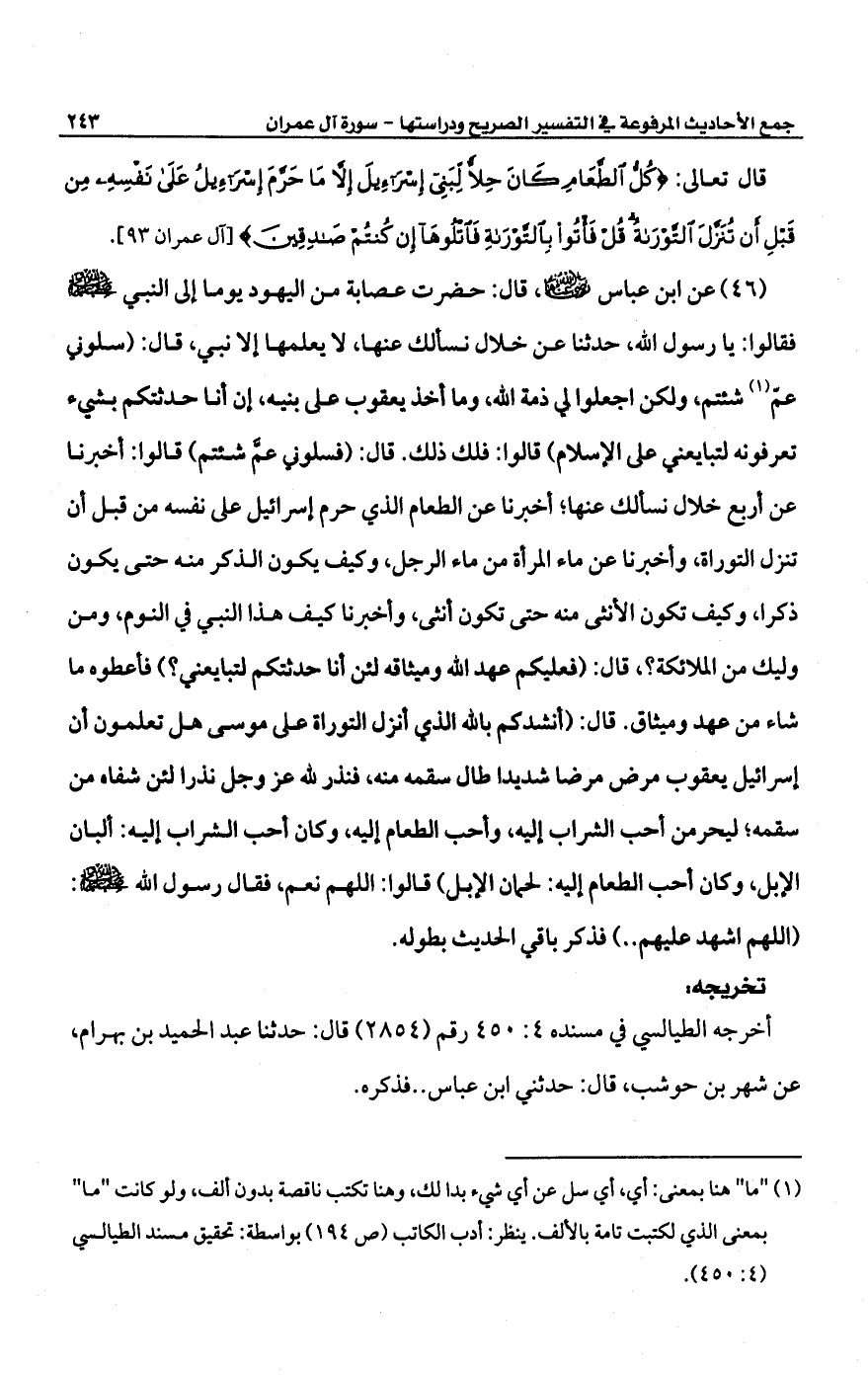 (46) عن ابن عباس -رضي الله عنهما-، قال: حضرت عصابة من اليهود يوما إلى النبي -صلى الله عليه وسلم- فقالوا: يا رسول الله، حدثنا عن خلال نسألك عنها، لا يعلمها إِلا نبي، قال: (سلوني عمَّ (¬1) شئتم ولكن اجعلوا لي ذمة الله، وما أخذ يعقوب على بنيه، إنَّ أنا حدثتكم بشيء تعرفونه لتبايعني على الإسلام) قالوا: فلك ذلك. قال: (فسلوني عمَّ شئتم) قالوا: أخبرنا عن أربع خلال نسألك عنها؛ أخبرنا عن الطعام الذي حرم إسرائيل على نفسه من قبل أن تنزل التوراة، وأخبرنا عن ماء المرأة من ماء الرجل، وكيف يكون الذكر منه حتى يكون ذكرا، وكيف تكون الأنثى منه حتى تكون أنثى، وأخبرنا كيف هذا النبي في النوم، ومن وليك من الملائكة؟، قال: (فعليكم عهد الله وميثاقه لئن أنا حدثتكم لتبايعني؟) فأعطوه ما شاء من عهد وميثاق. قال: (أنشدكم بالله الذي نزل التوراة على موسى هل تعلمون أن إسرائيل يعقوب مرض مرضا شديدا طال سقمه منه، فنذر لله عز وجل نذرا لئن شفاه من سقمه؛ ليحرمن أحب الشراب إليه، وأحب الطعام إليه، وكان أحب الشراب إليه: ألبان الأبل، وكان أحب الطعام إليه: لحمان الإبل) قالوا: اللهم نعم، فقال رسول الله -صلى الله عليه وسلم-: (اللهم اشهد عليهم ..) فذكر باقي الحديث بطوله.
