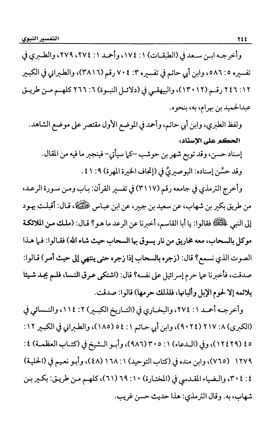 وأخرج الترمذي في جامعه رقم (3117) في تفسير القرآن: باب ومن سورة الرعد، من طريق بكير بن شهاب، عن سعيد بن جبير، عن ابن عباس -رضي الله عنهما-، قال: أقبلت يهود إلى النبي -صلى الله عليه وسلم- فقالوا: يا أبا القاسم، أخبرنا عن الرعد ما هو؟ قال: (ملك من الملائكة موكل بالسحاب معه مخاريق من نار يسوق بها السحاب حيث شاء الله) فقالوا: فما هذا الصوت الذي نسمع؟ قال: (زجره بالسحاب إذا زجره حتى ينتهي إلى حيث أمر) قالوا: صدقت، فأخبرنا عما حرم إسرائيل على نفسه؟ قال: (اشتكى عرق النسا، فلم يجد شيئا يلائمه إِلا لحوم الإبل وألبانها، فلذلك حرمها) قالوا: صدقت.